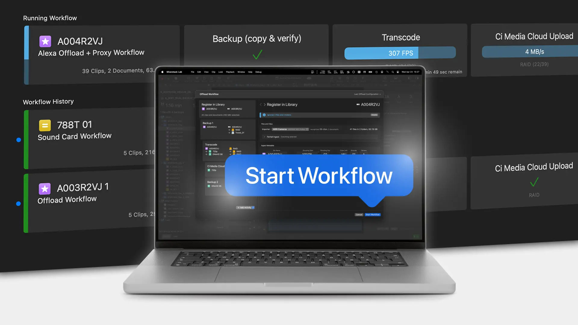这就是Silverstack v9.0中全新的工作流概念发挥作用的地方,它重新定义了您使用该软件管理任务清单的方式:工作流让您可以将装载、备份、转码和上传等活动链接到一个单一的自动化管线中。由于Silverstack可以提前了解整个工作流的范围,它能够智能地优化执行,并尽可能并行运行任务。结果就是:更快的完成、更少的手动步骤,以及清晰、结构化的流程概览。它还可以帮助您轻松复制例行任务,因为您可以将工作流保存为预设,在处理新数据卡时随时应用。