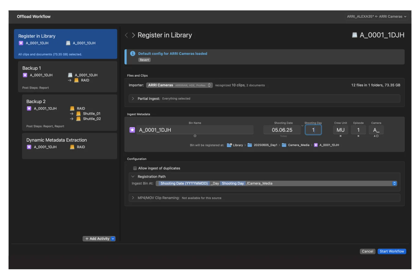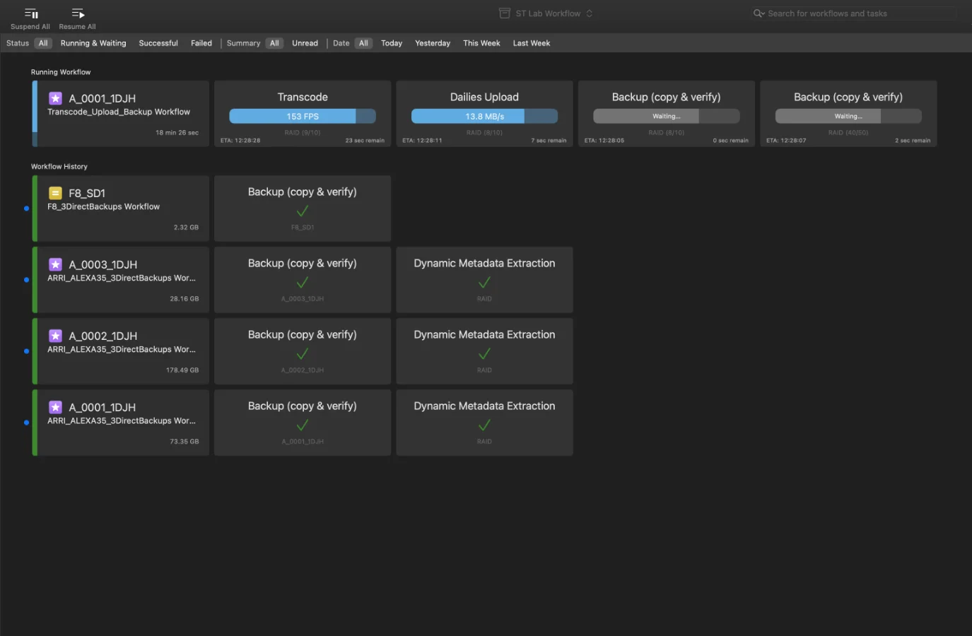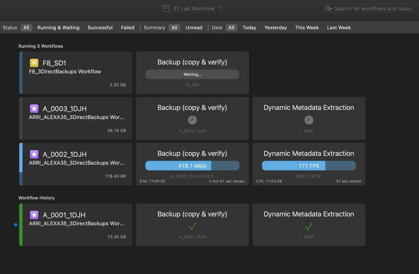 首先创建一个装载工作流,涵盖待办任务清单的第一部分。在下面的例子中,我们将装载和备份链接为一个单一过程,并包括关键信息的元数据导入,如拍摄日、拍摄日期、摄制组等。一旦配置完成,这个工作流将自动运行 — 无需再手动触发每个步骤。同样,使用“工作视图”来监控所有过程。