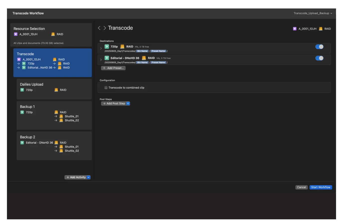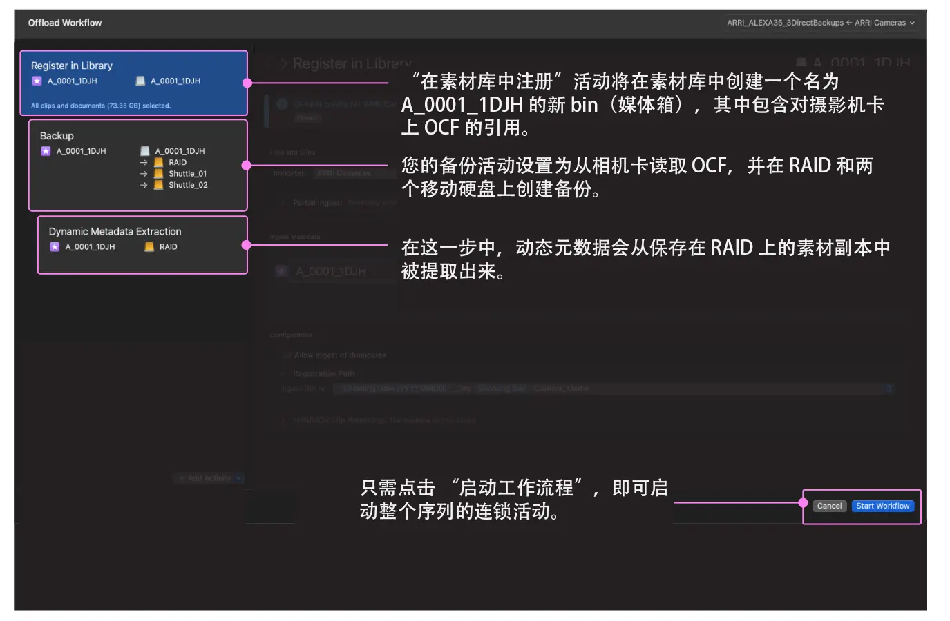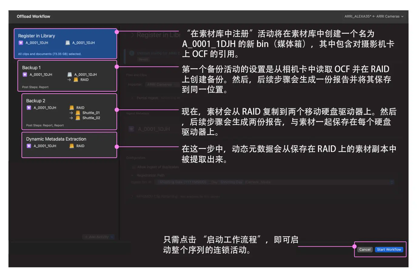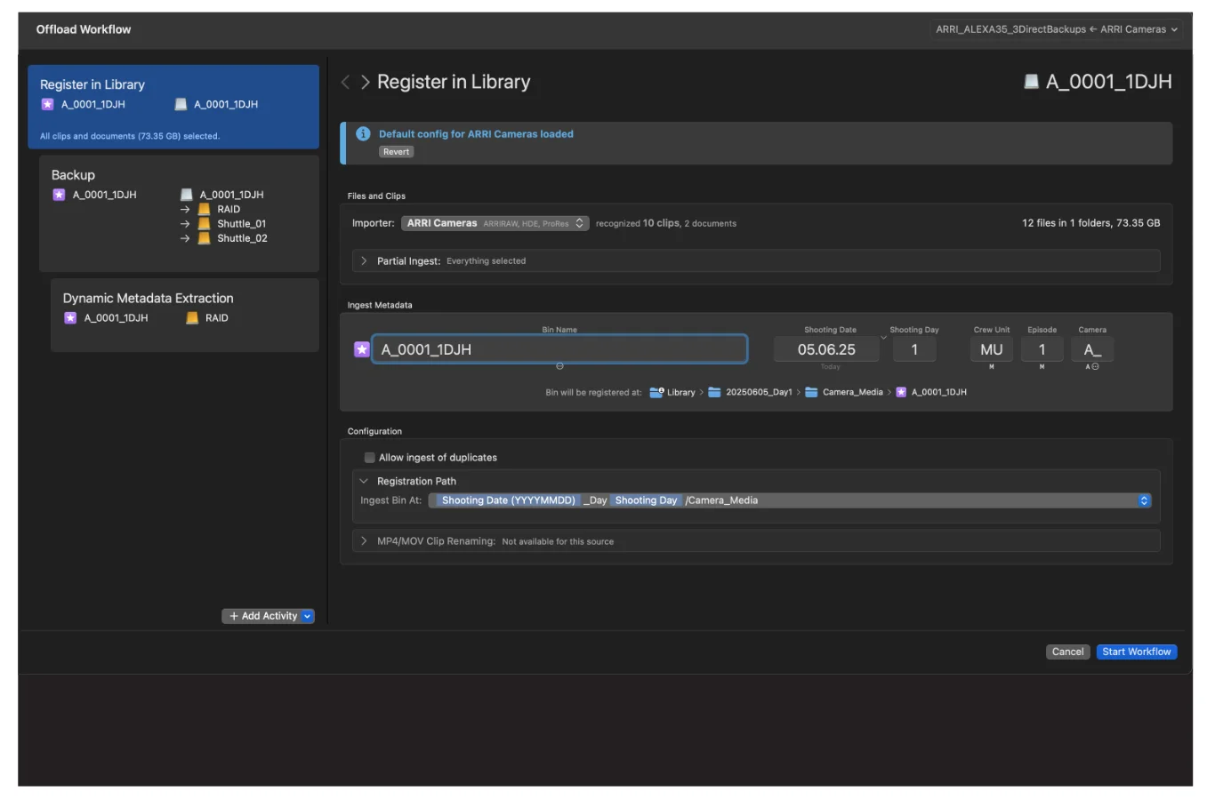首先创建一个装载工作流,涵盖待办任务清单的第一部分。在下面的例子中,我们将装载和备份链接为一个单一过程,并包括关键信息的元数据导入,如拍摄日、拍摄日期、摄制组等。一旦配置完成,这个工作流将自动运行 — 无需再手动触发每个步骤。同样,使用“工作视图”来监控所有过程。