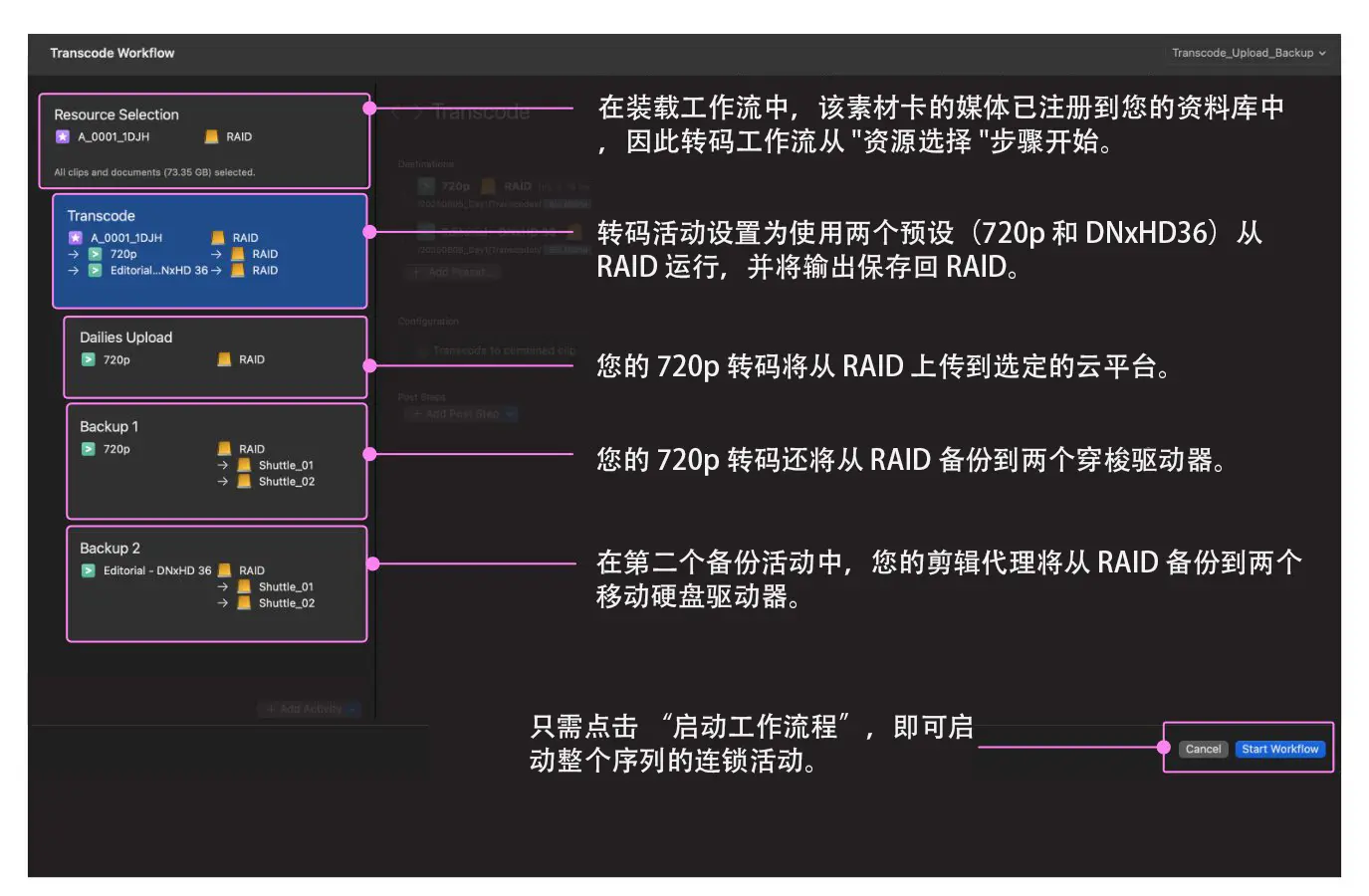 通过新的工作流概念,您可以将所有这些活动连接成一个单一的集成过程,使您的工作更快、更轻松且错误更少。它还提供了更大的清晰度,因为您可以直观地查看所有计划执行的活动 — 不再需要手动列表来跟踪每个步骤是否已完成。下图显示了为我们的示例待办事项清单配置的工作流,涵盖了处理摄影机素材卡的所有必要步骤。